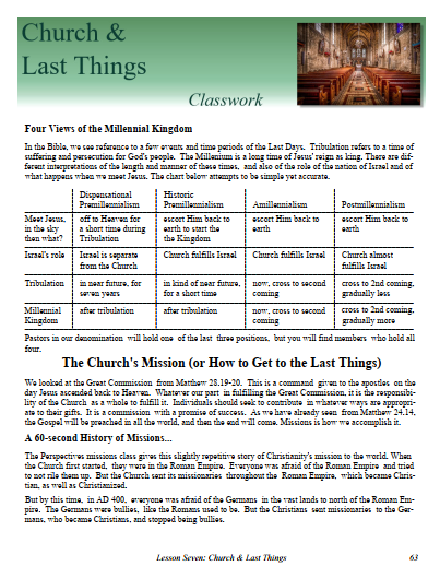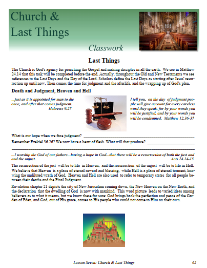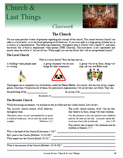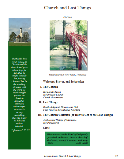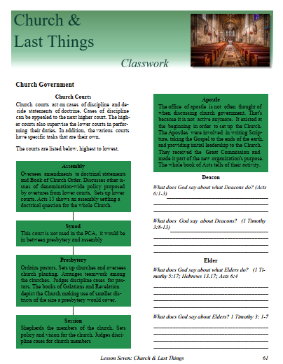 The course contains eight lessons and an appendix covering the Gospel and the rest of systematic theology at a fourth or fifth grade level. The teaching makes heavy use of Scripture and is supplemented with catechism, vocabulary, and teacher’s notes.